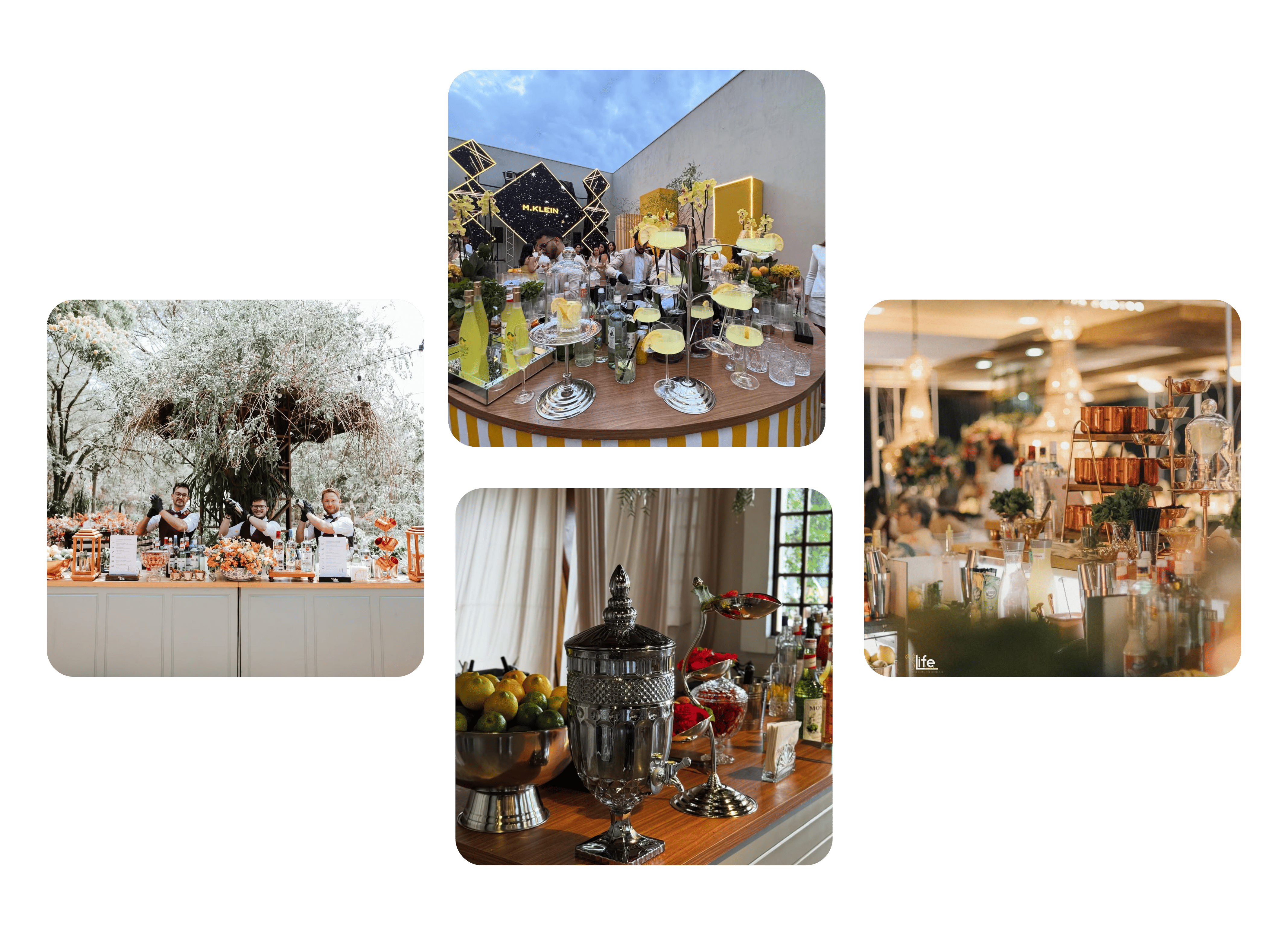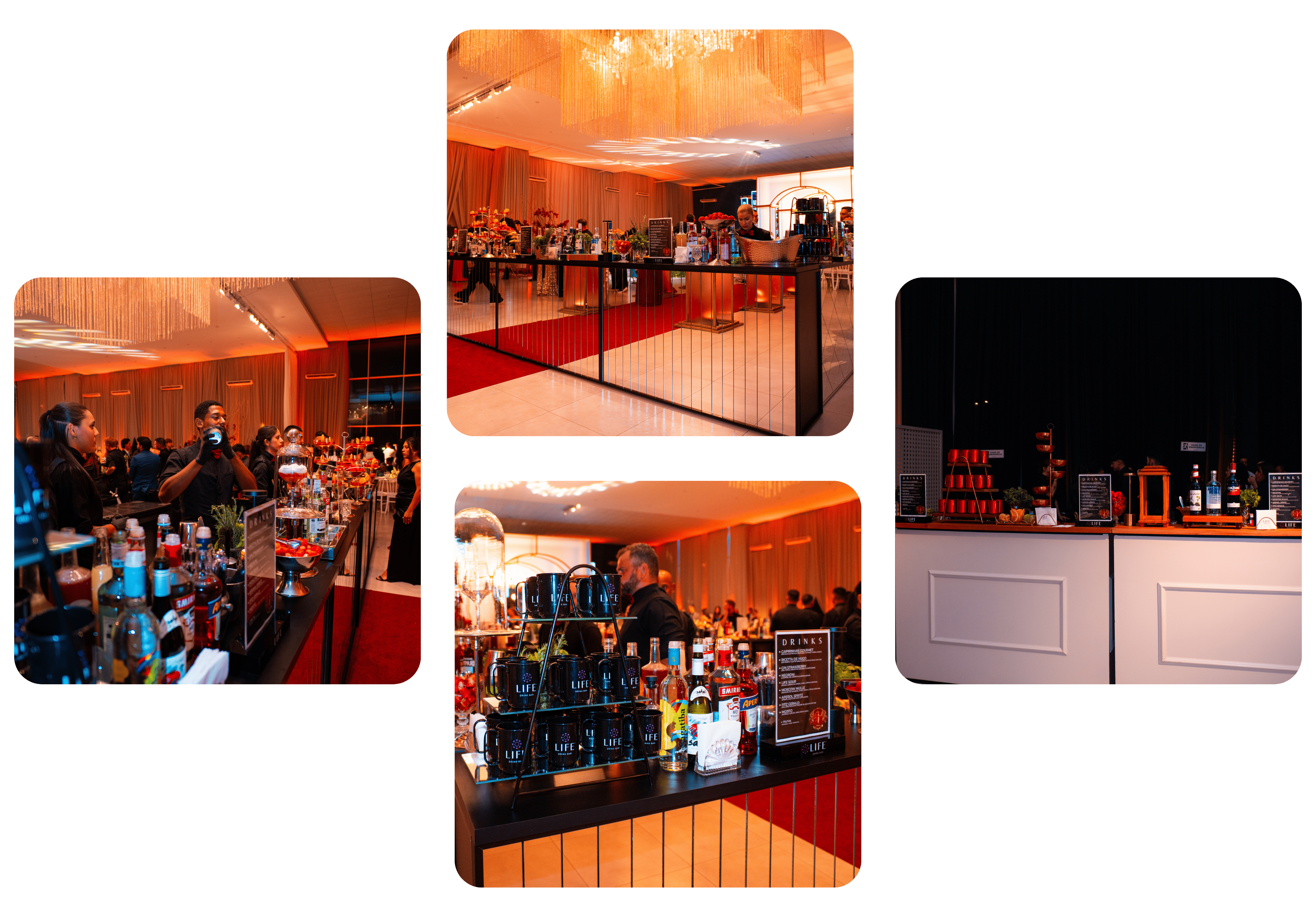 Bar de Negroni, Welcome Drinks, Shots personalizados, Tequileiro, Whiskeria, Máquina de Fumaça ou Bolhas, elementos que surpreendem e encantam.